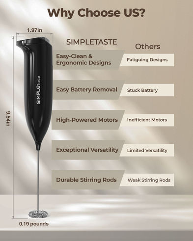 SIMPLETASTE Milk Frother Handheld Electric Foam Maker, Drink Mixer with Stainless Steel Whisk for Cappuccino, Bulletproof Coffee, Latte, Midnight Black, without Stand, Battery Operated