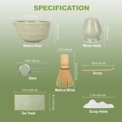 SIMPLETaste Matcha Whisk Set, Ceramic Matcha Kit Includes Bowl, Whisk and Holder, Bamboo Scoop, Scoop Rest, Sifter and Tea Towel - 7 Pcs Matcha Kit for Macha Lovers (Green)